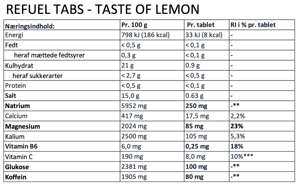 Ingredienser: Syre (citronsyre, natriumhydrogencarbonat), fyldemiddel (sorbitol), aroma (citron), magnesiumcarbonat, kaliumchlorid, dextrose, koffein, calciumcarbonat, majsstivelse, sødestof (sucralose), L-ascorbinsyre (vitamin C), farvestof (riboflavin), maltodextrin, pyridoxinhydrochlorid (vitamin B6).
