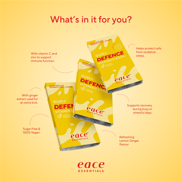 Dette tyggegummi fra Eace indeholder 12 pakker med hver 10 stykker – i alt 120 stykker til langvarig brug. Det er produceret i Danmark og er 100% vegansk, med C-vitamin, zink som zinkcitrat og ingefærrodsekstrakt fra Zingiber officinale Roscoe. Det er sukkerfrit og sødet med xylitol, sorbitol og sukralose.