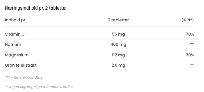 - 200 mg natrium, 56 mg magnesium pr. tablet