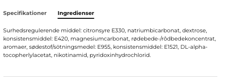 Surhedsregulerende middel: E330, natriumbicarbonat (natrium), dextrose, konsistensmiddel: E420, magnesiumkabonat (magnesium), aromaer, farve: E162, konsistensmiddel: E1521, sødestof E955, DL-alpha-tocopherylacetat (vitamin E), nikotinamid (niacin), farve: E101, pyridoxinhydrochlorid (vitamin B6).