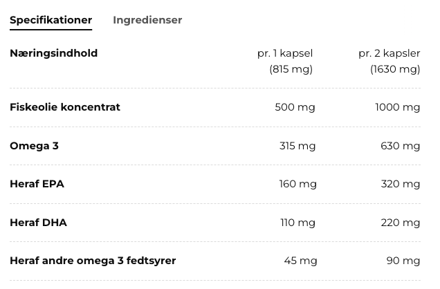 - 500 mg fiskeolie koncentrat med naturligt indhold