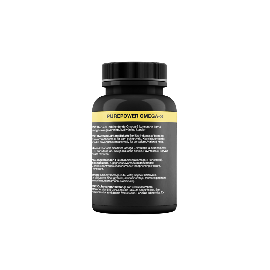 PurePower Omega-3 er baseret på fiskeolie fra fede fisk som makrel, sild, laks, ørred og ål. Hver kapsel indeholder 500 mg fiskeoliekoncentrat med 315 mg omega-3-fedtsyrer, der understøtter din daglige kost med essentielle næringsstoffer.
