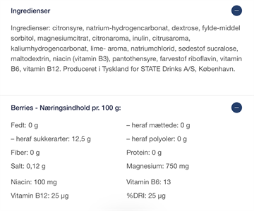 Surhedsregulerende middel: E330, natriumbicarbonat (natrium), dextrose, konsistensmiddel: E420, magnesiumkabonat (magnesium), aromaer, farve: E162, konsistensmiddel: E1521, sødestof E955, DL-alpha-tocopherylacetat (vitamin E), nikotinamid (niacin), farve: E101, pyridoxinhydrochlorid (vitamin B6).